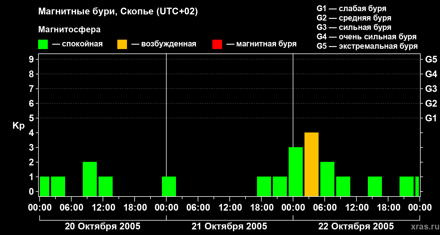 Изменения геомагнитного индекса Kp с 20 по 22 октября 2005 года для средних широт