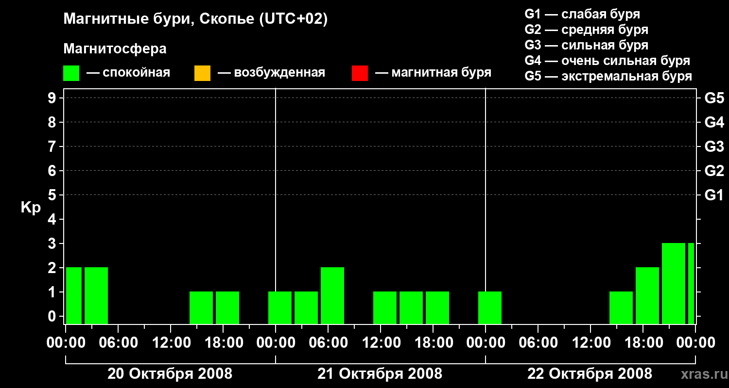 Изменения геомагнитного индекса Kp с 20 по 22 октября 2008 года для средних широт