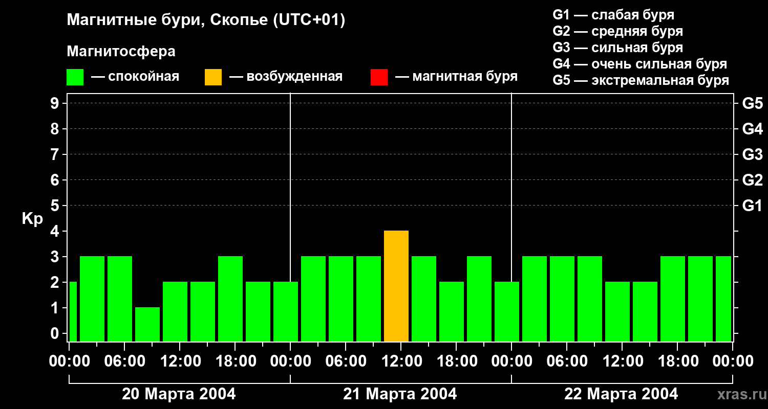 Изменения геомагнитного индекса Kp с 20 по 22 марта 2004 года для средних широт