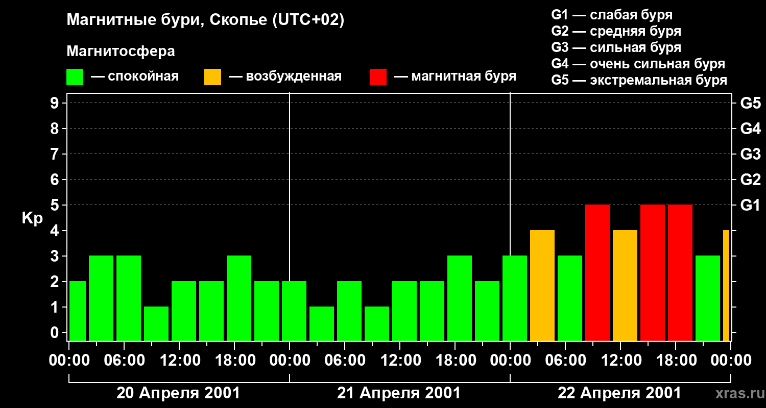 Изменения геомагнитного индекса Kp с 20 по 22 апреля 2001 года для средних широт
