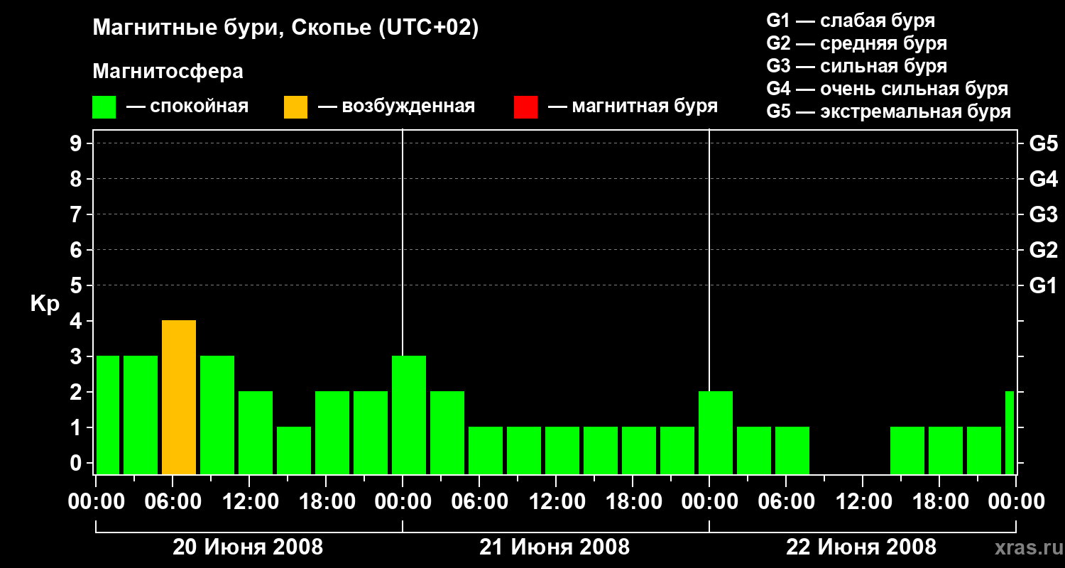 Изменения геомагнитного индекса Kp с 20 по 22 июня 2008 года для средних широт