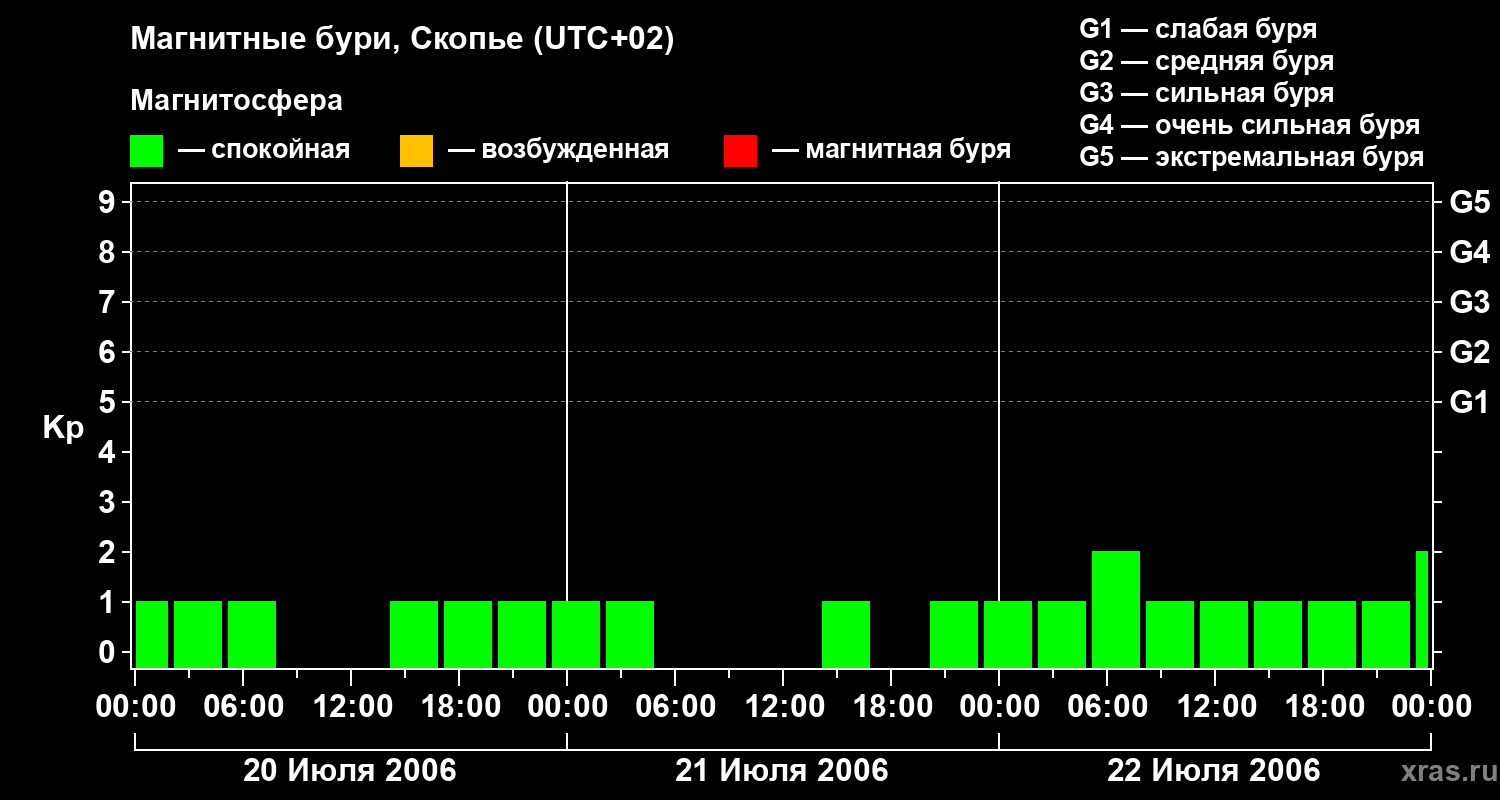 Изменения геомагнитного индекса Kp с 20 по 22 июля 2006 года для средних широт