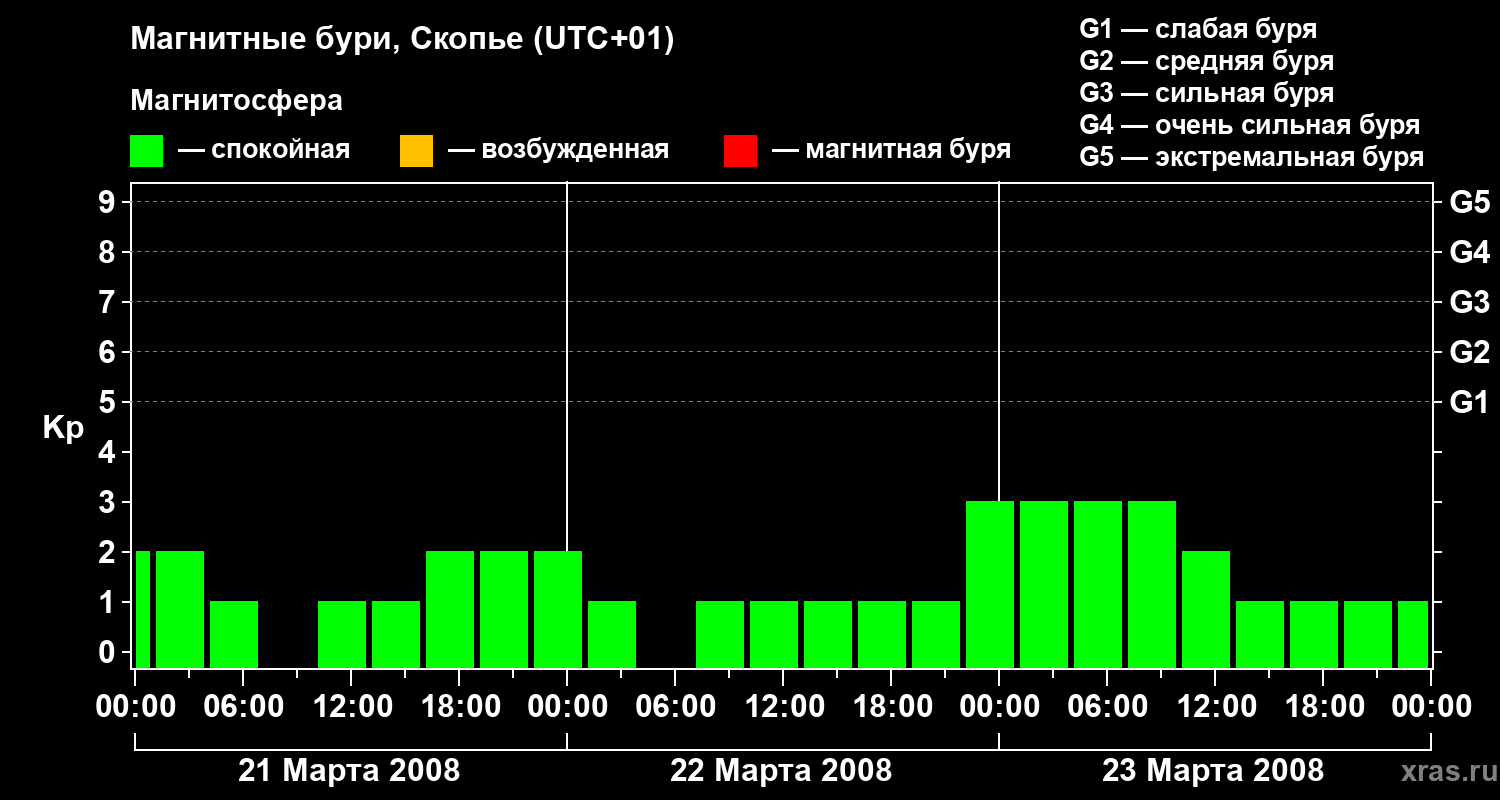 Изменения геомагнитного индекса Kp с 21 по 23 марта 2008 года для средних широт