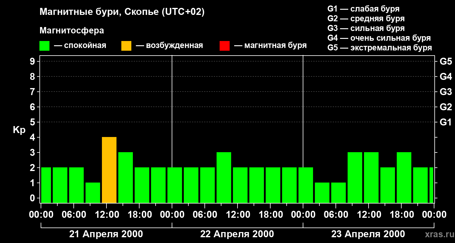 Изменения геомагнитного индекса Kp с 21 по 23 апреля 2000 года для средних широт