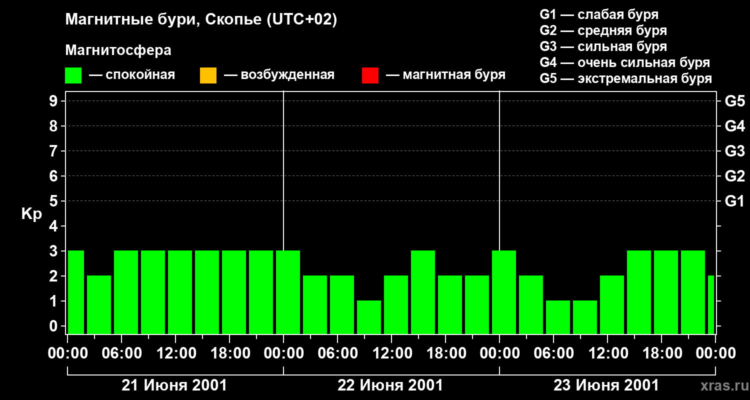 Изменения геомагнитного индекса Kp с 21 по 23 июня 2001 года для средних широт