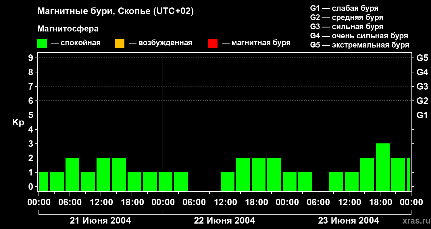 Изменения геомагнитного индекса Kp с 21 по 23 июня 2004 года для средних широт