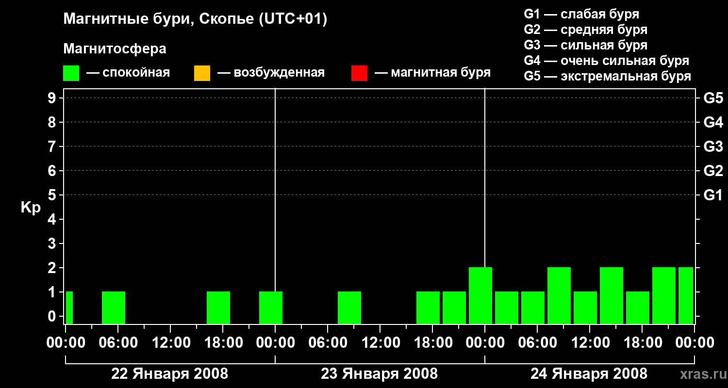 Изменения геомагнитного индекса Kp с 22 по 24 января 2008 года для средних широт