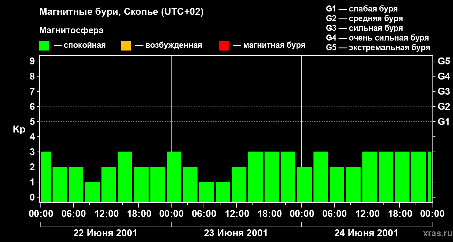 Изменения геомагнитного индекса Kp с 22 по 24 июня 2001 года для средних широт