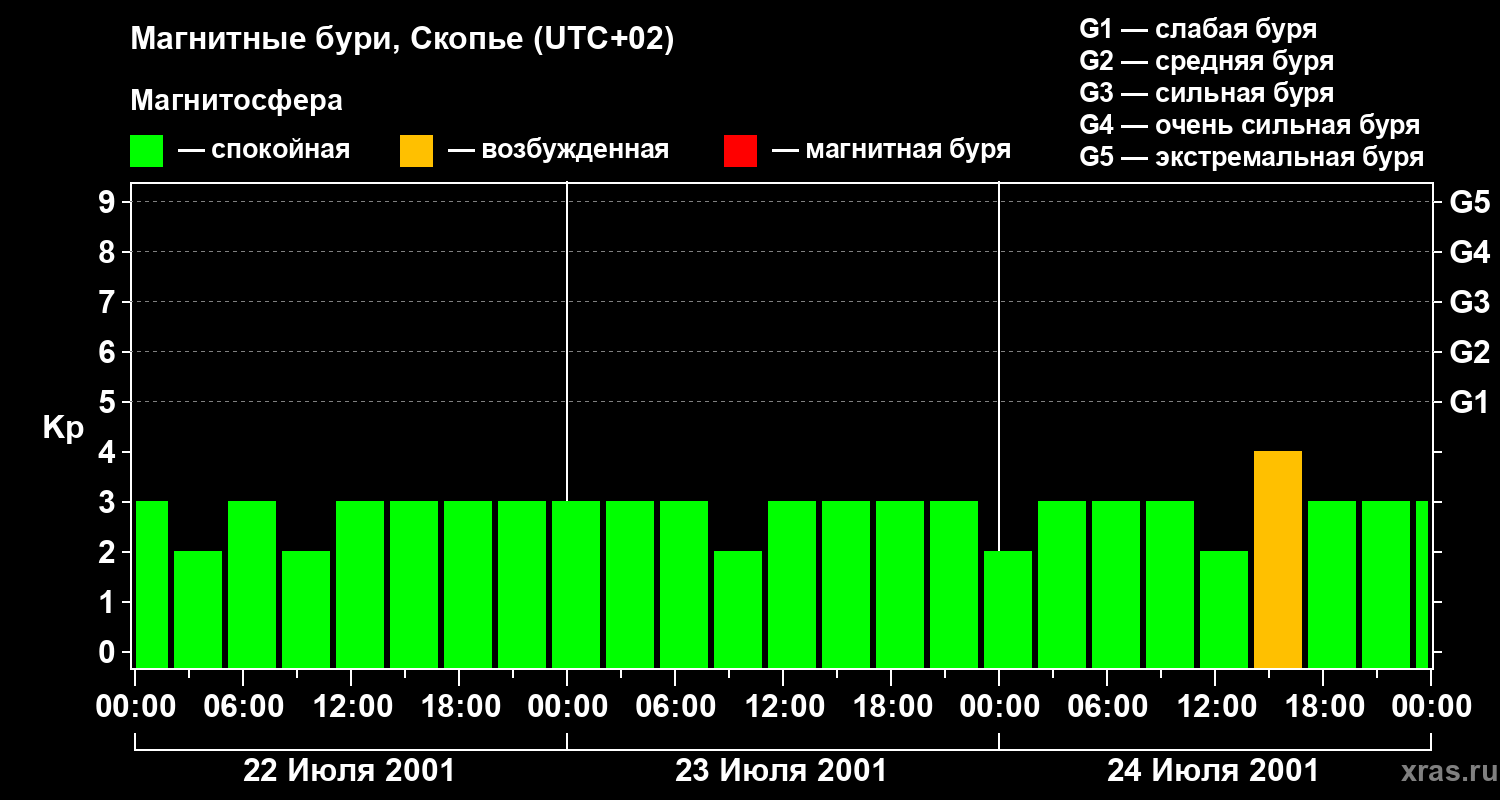 Изменения геомагнитного индекса Kp с 22 по 24 июля 2001 года для средних широт