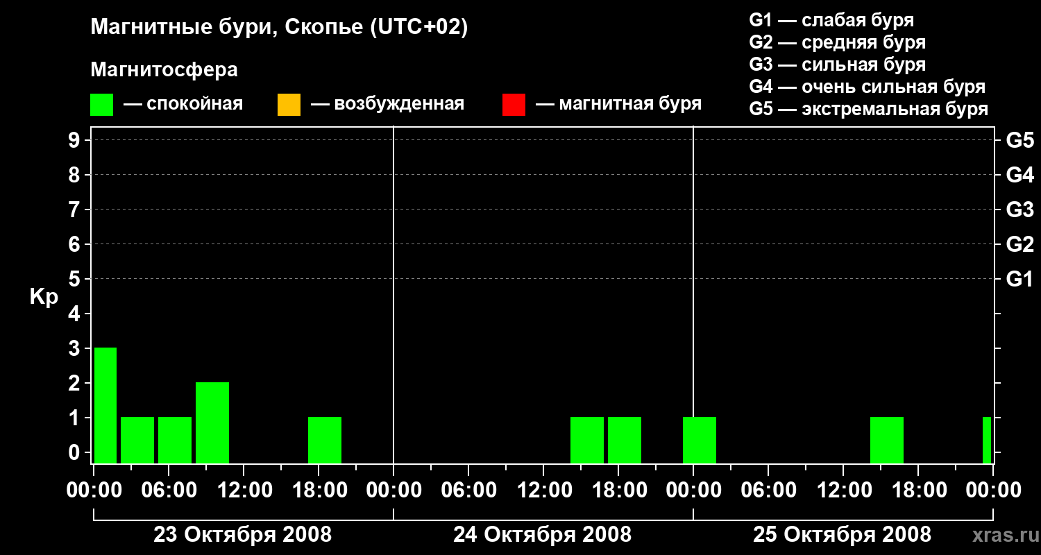 Изменения геомагнитного индекса Kp с 23 по 25 октября 2008 года для средних широт