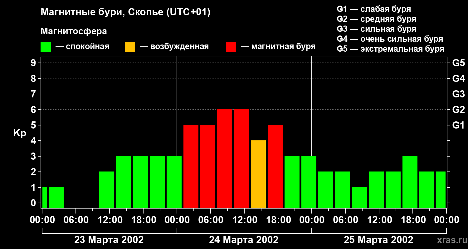 Изменения геомагнитного индекса Kp с 23 по 25 марта 2002 года для средних широт