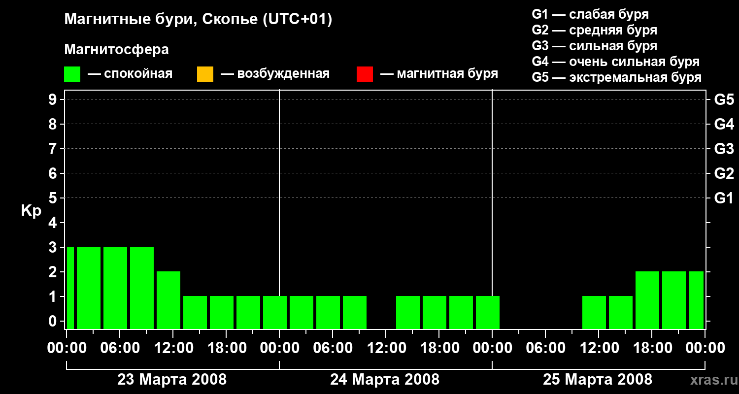 Изменения геомагнитного индекса Kp с 23 по 25 марта 2008 года для средних широт
