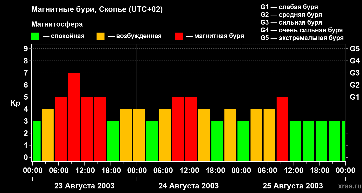 Изменения геомагнитного индекса Kp с 23 по 25 августа 2003 года для средних широт