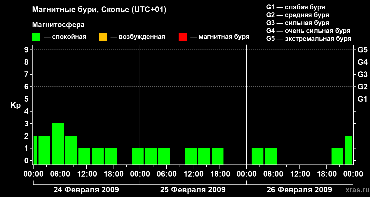 Изменения геомагнитного индекса Kp с 24 по 26 февраля 2009 года для средних широт