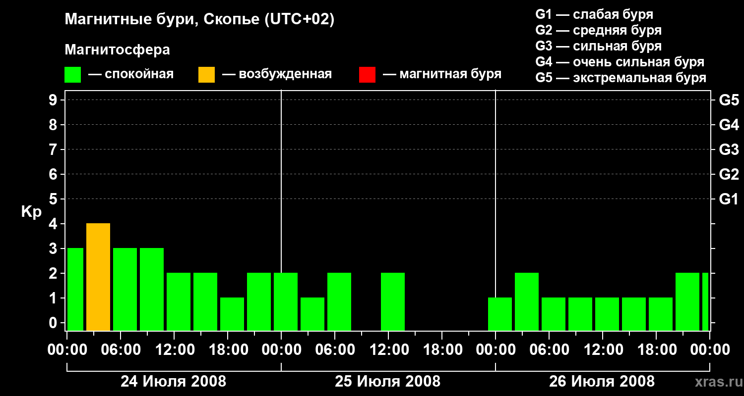 Изменения геомагнитного индекса Kp с 24 по 26 июля 2008 года для средних широт