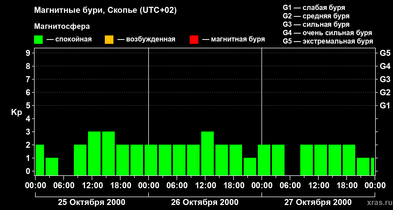 Изменения геомагнитного индекса Kp с 25 по 27 октября 2000 года для средних широт