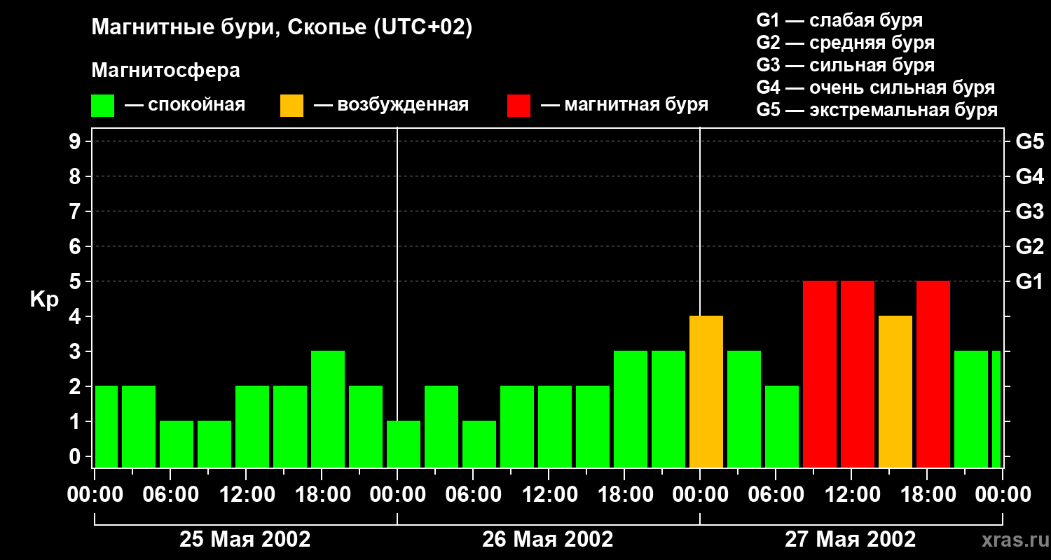 Изменения геомагнитного индекса Kp с 25 по 27 мая 2002 года для средних широт