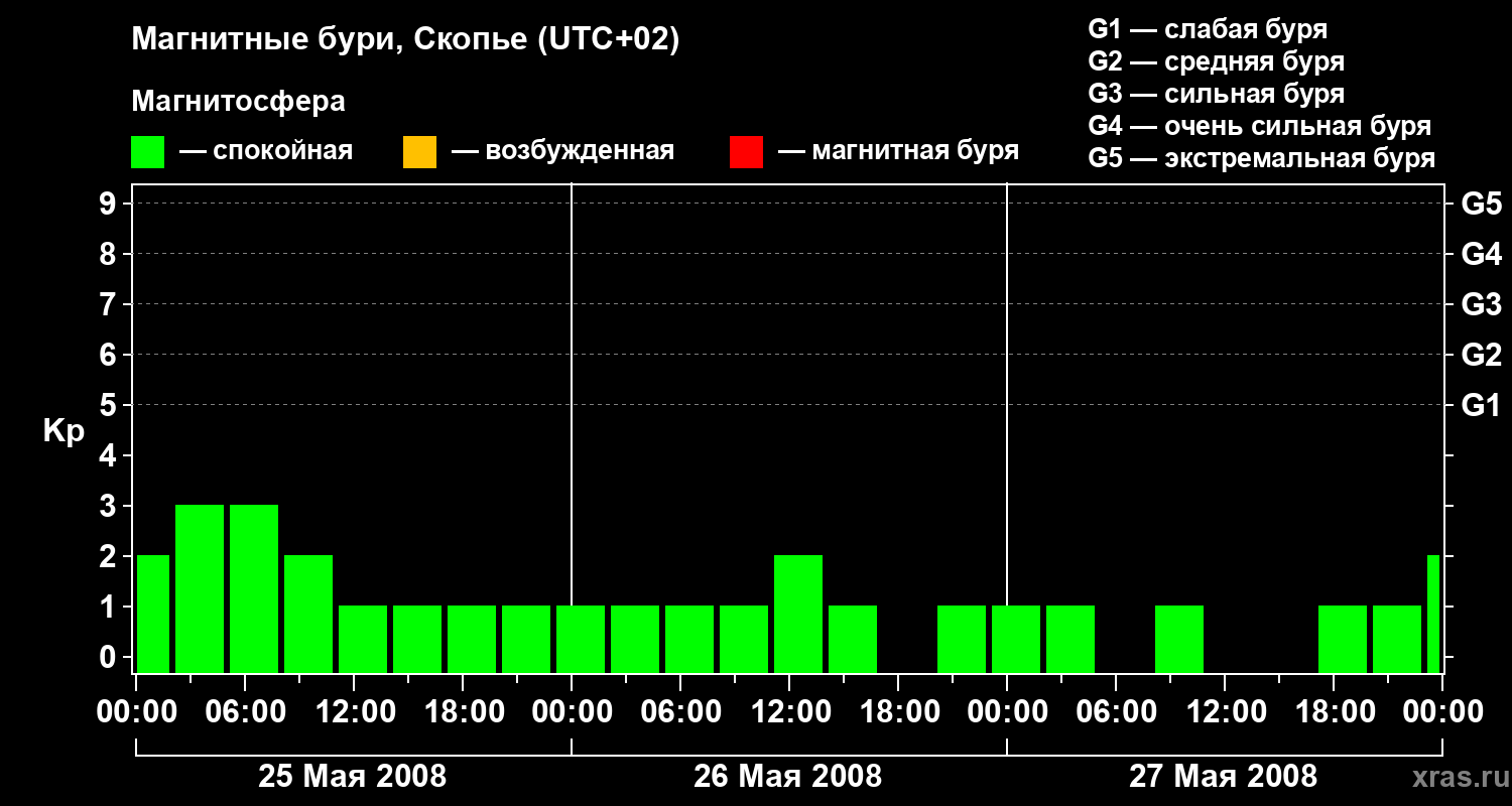 Изменения геомагнитного индекса Kp с 25 по 27 мая 2008 года для средних широт