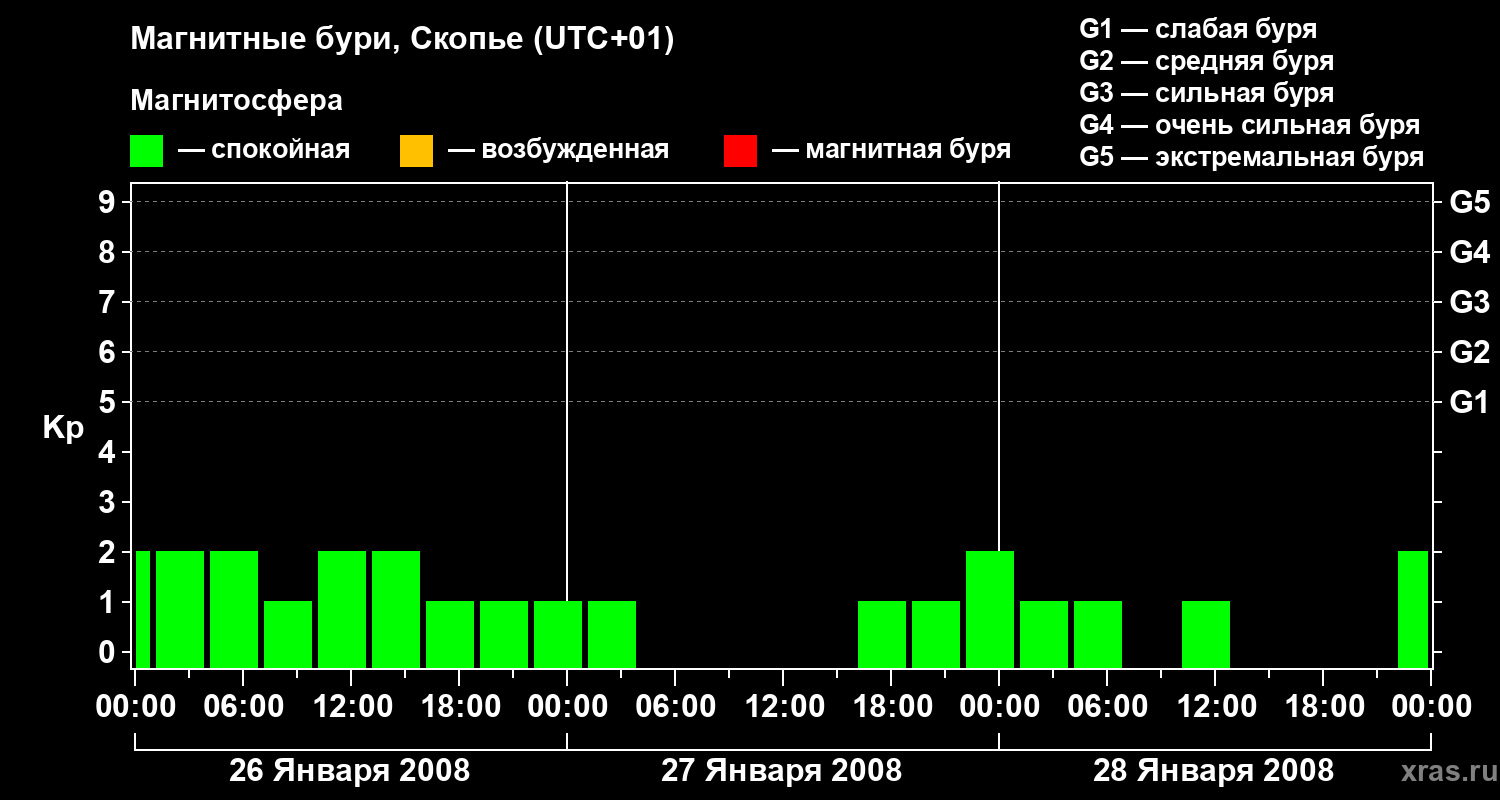 Изменения геомагнитного индекса Kp с 26 по 28 января 2008 года для средних широт