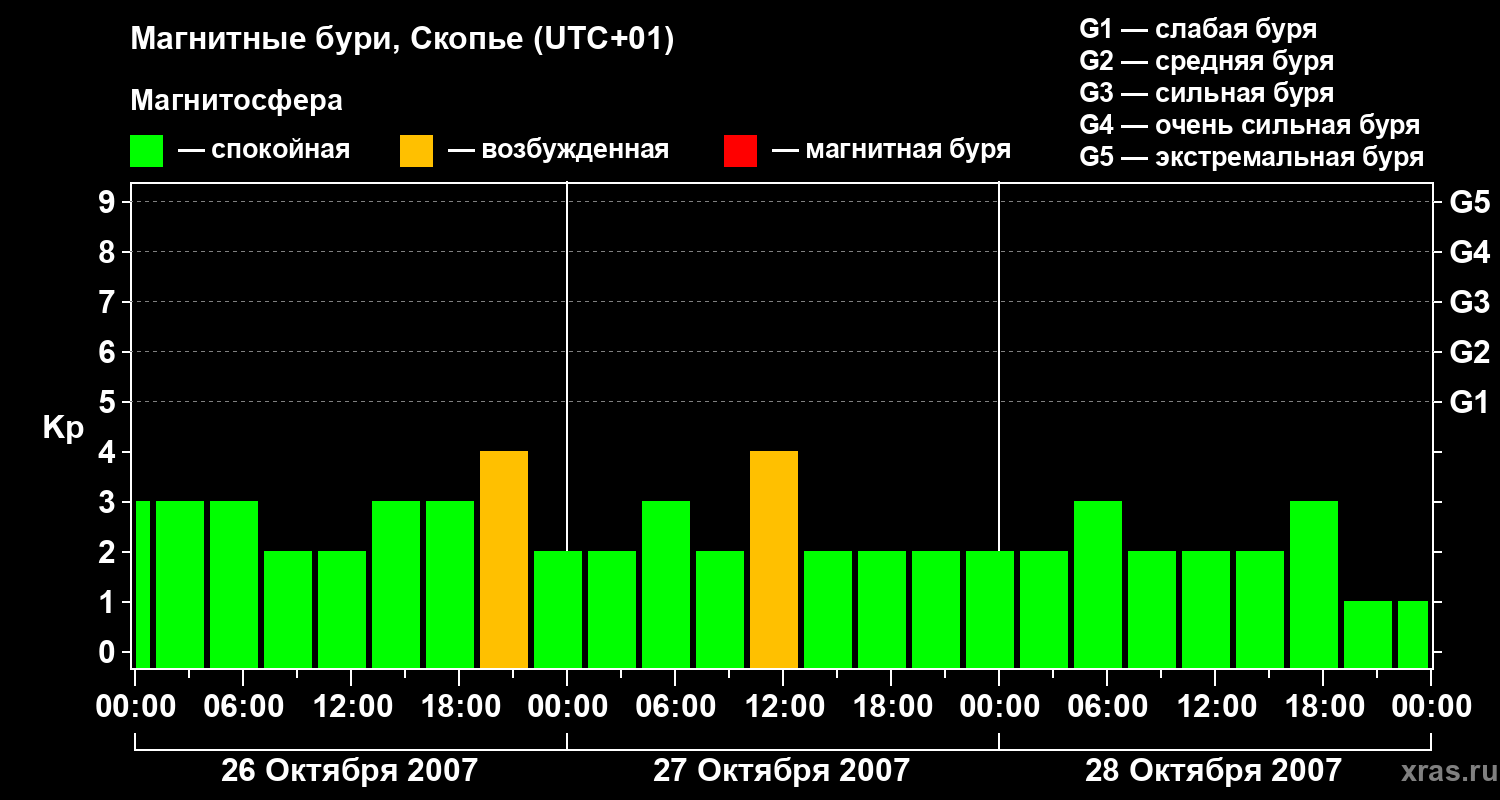 Изменения геомагнитного индекса Kp с 26 по 28 октября 2007 года для средних широт