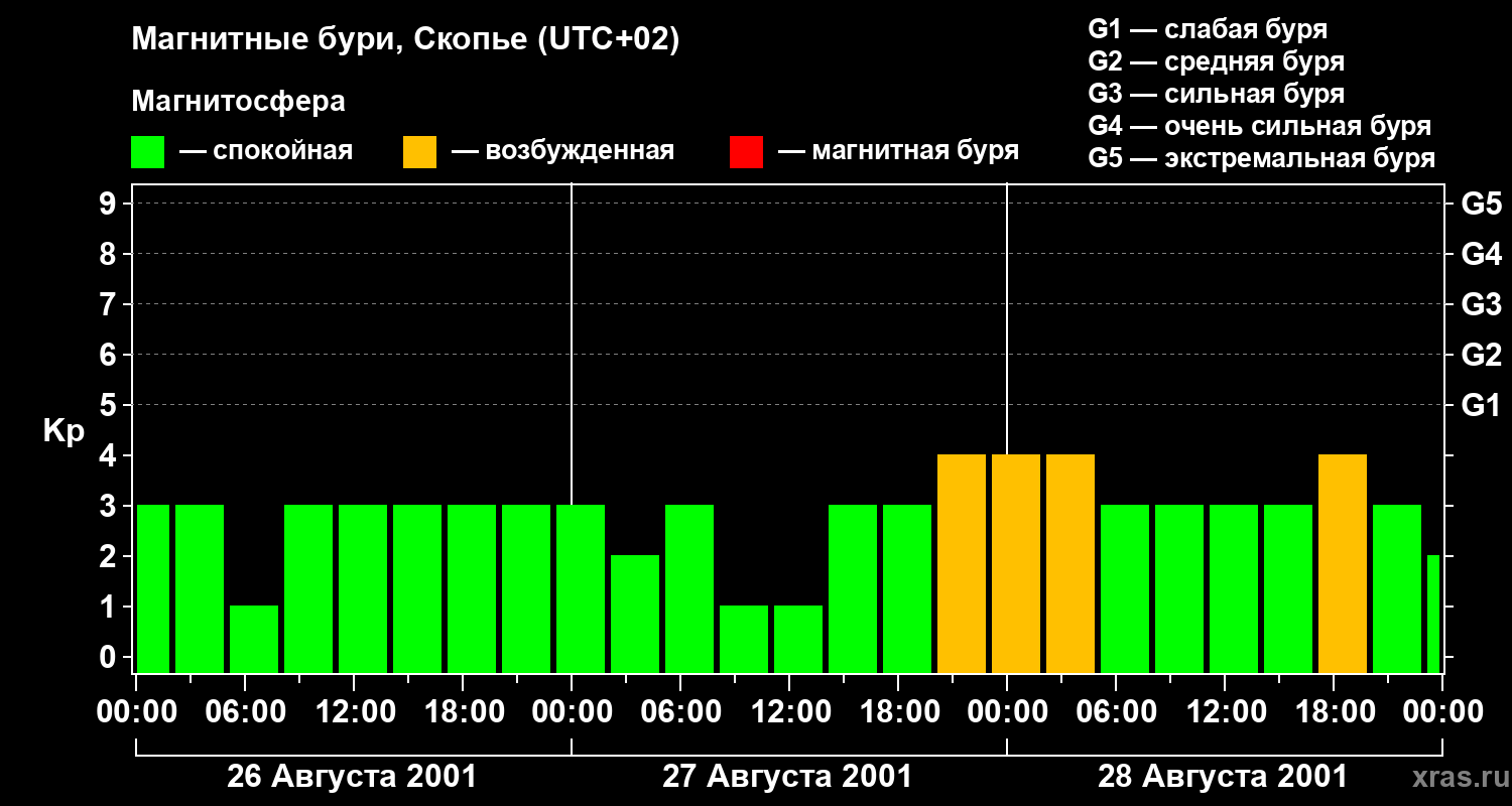 Изменения геомагнитного индекса Kp с 26 по 28 августа 2001 года для средних широт