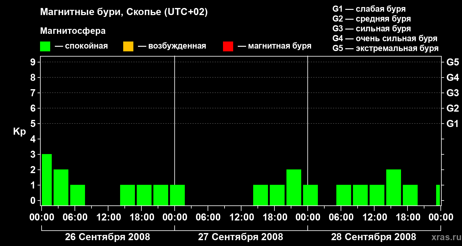 Изменения геомагнитного индекса Kp с 26 по 28 сентября 2008 года для средних широт