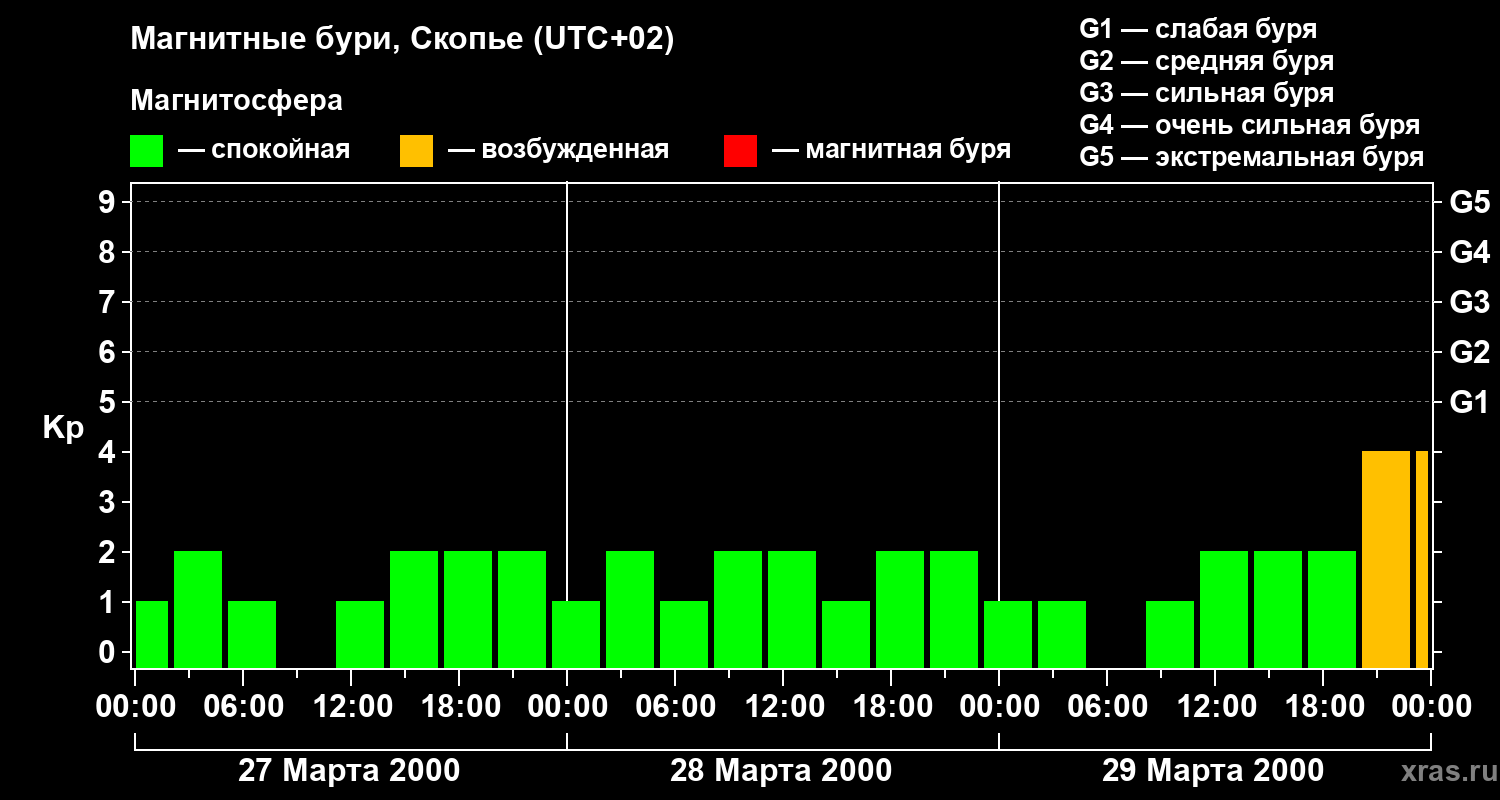 Изменения геомагнитного индекса Kp с 27 по 29 марта 2000 года для средних широт