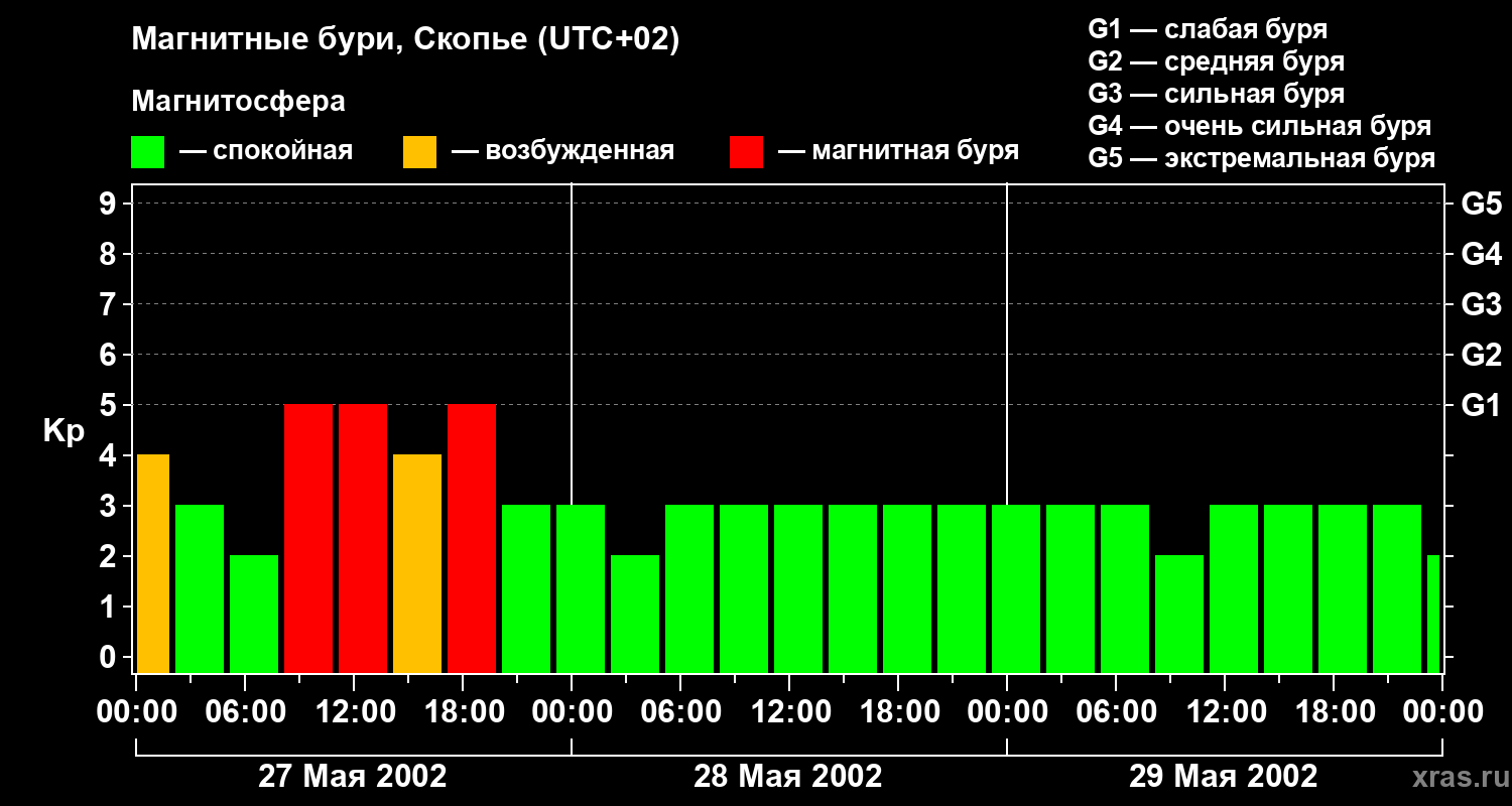 Изменения геомагнитного индекса Kp с 27 по 29 мая 2002 года для средних широт