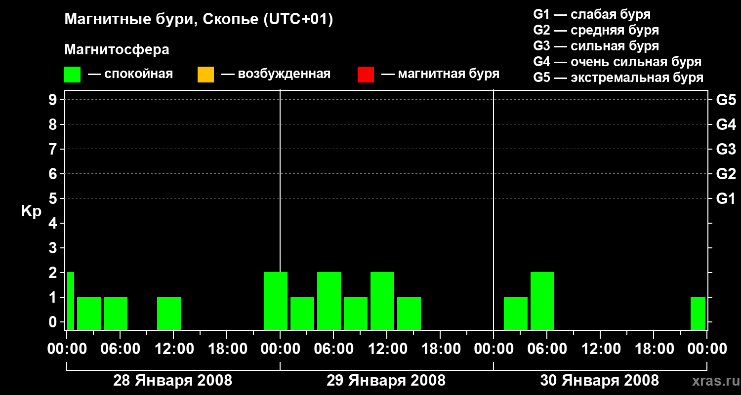 Изменения геомагнитного индекса Kp с 28 по 30 января 2008 года для средних широт