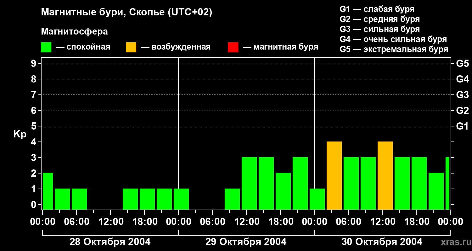 Изменения геомагнитного индекса Kp с 28 по 30 октября 2004 года для средних широт
