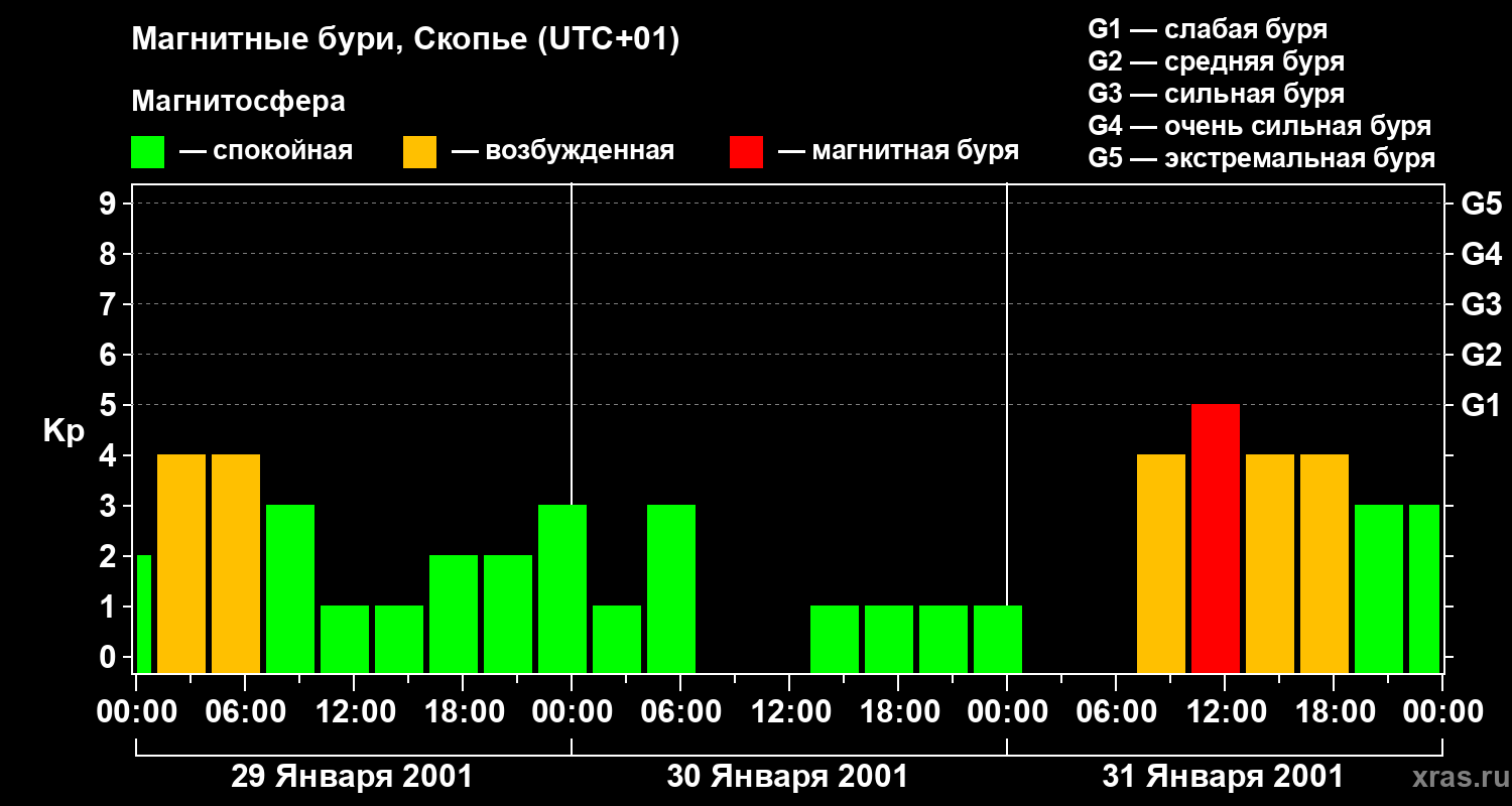 Изменения геомагнитного индекса Kp с 29 по 31 января 2001 года для средних широт