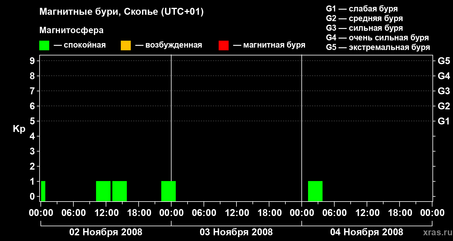 Изменения геомагнитного индекса Kp с 2 по 4 ноября 2008 года для средних широт