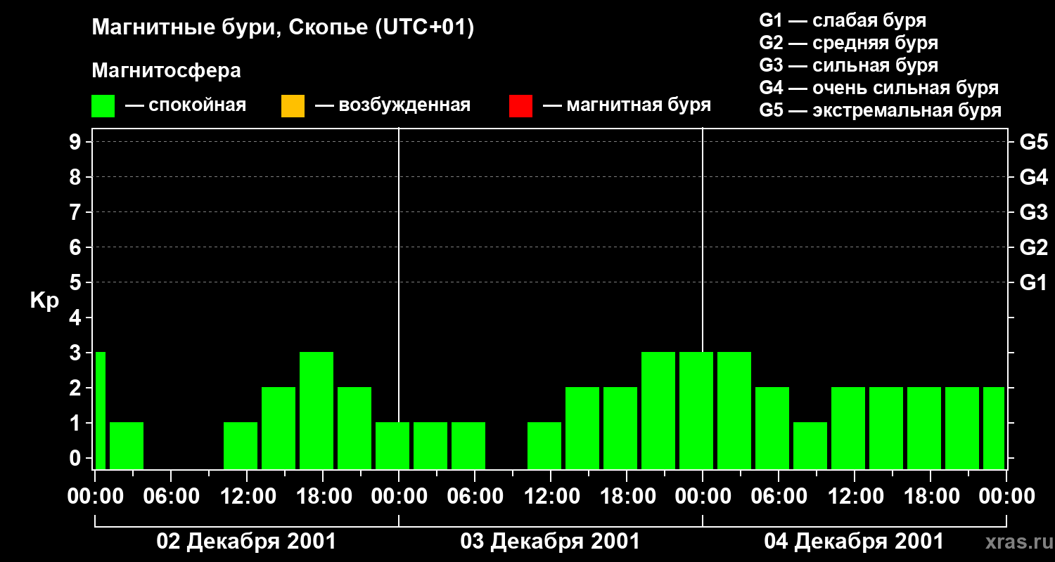 Изменения геомагнитного индекса Kp с 2 по 4 декабря 2001 года для средних широт