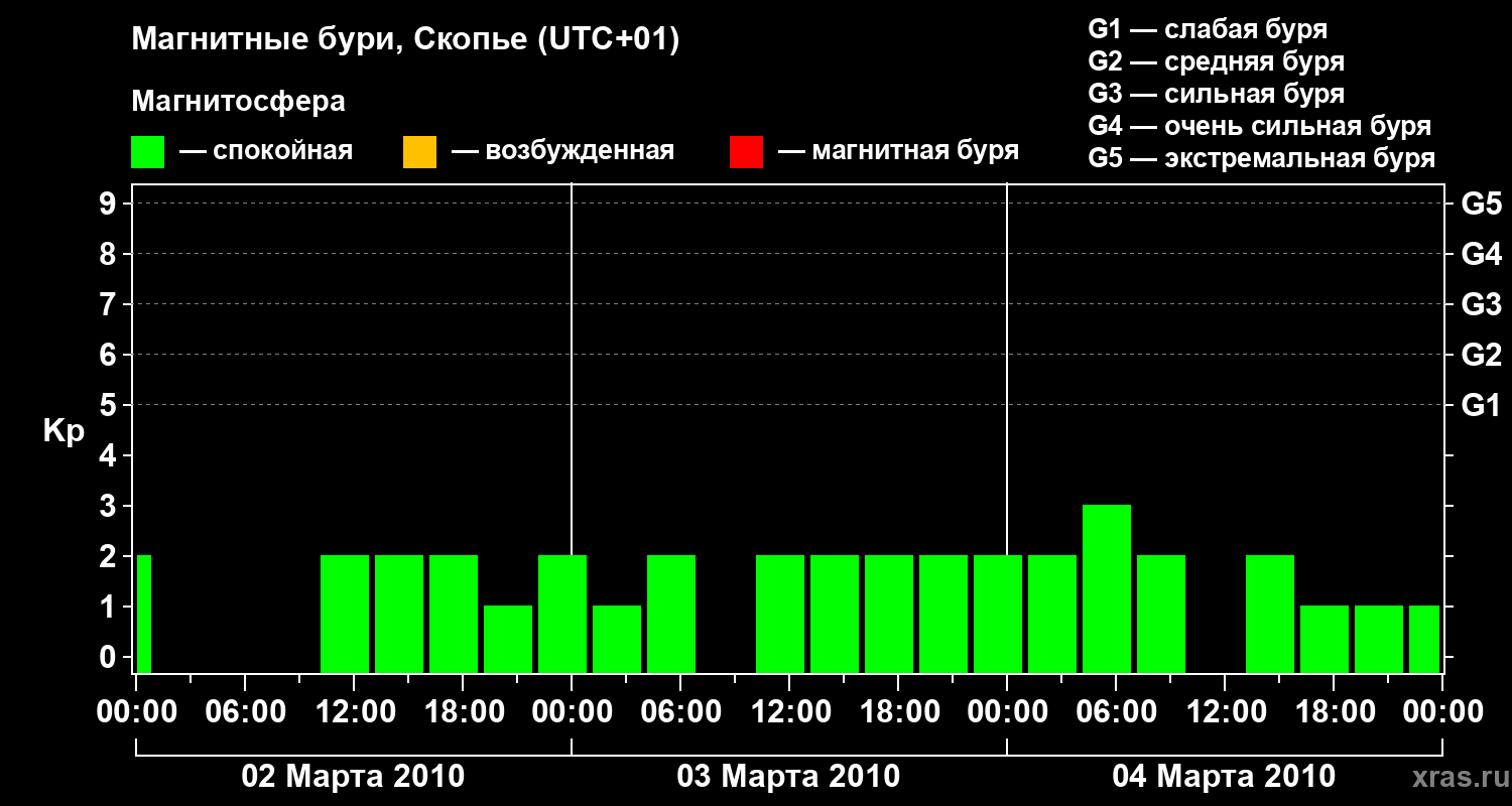 Изменения геомагнитного индекса Kp с 2 по 4 марта 2010 года для средних широт
