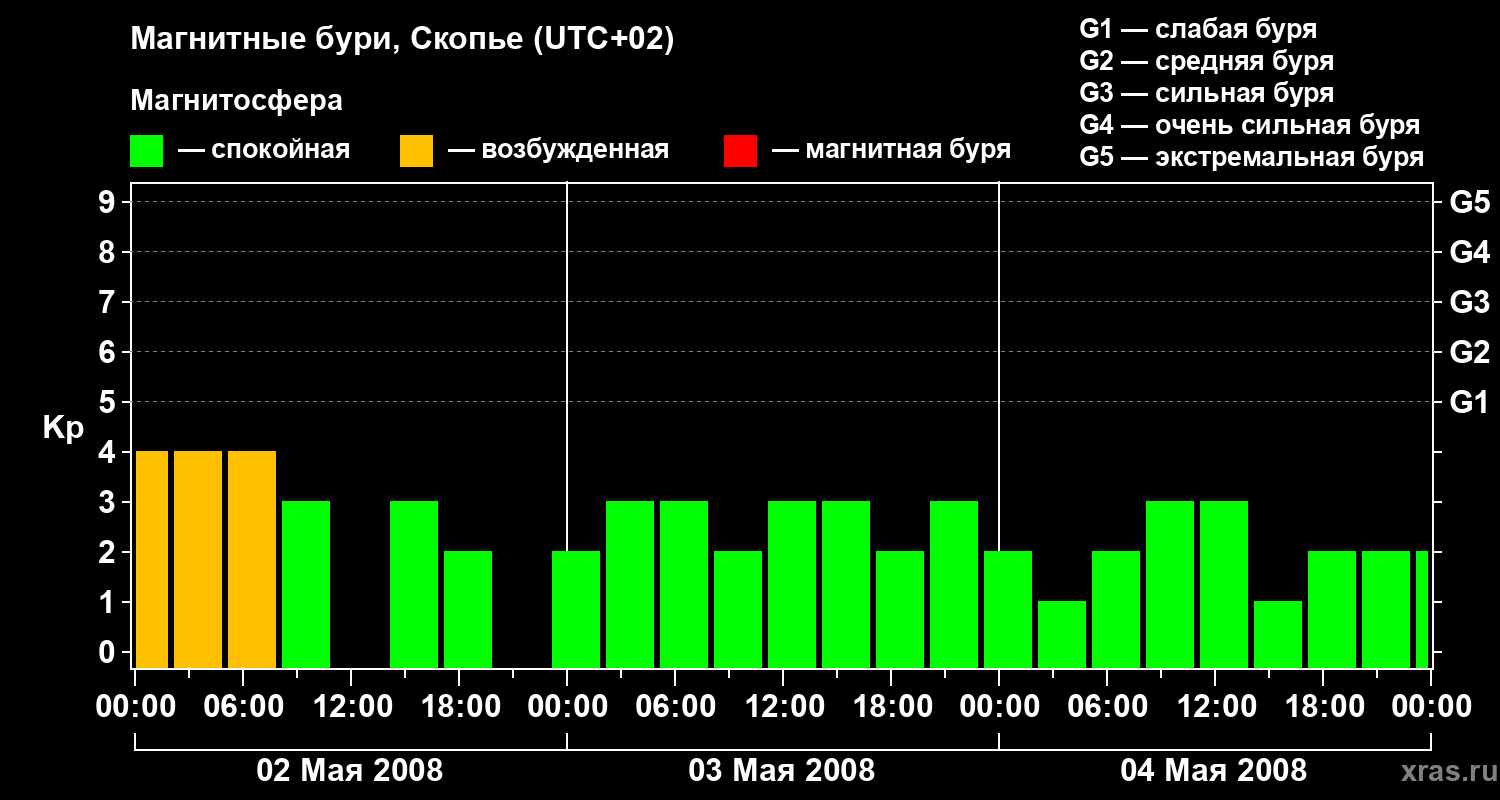 Изменения геомагнитного индекса Kp с 2 по 4 мая 2008 года для средних широт