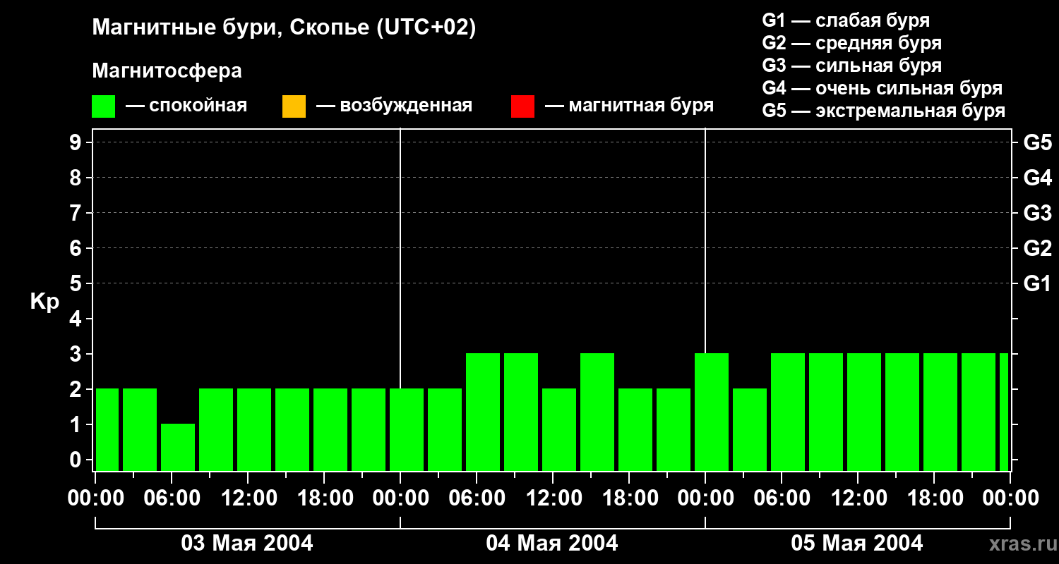Изменения геомагнитного индекса Kp с 3 по 5 мая 2004 года для средних широт