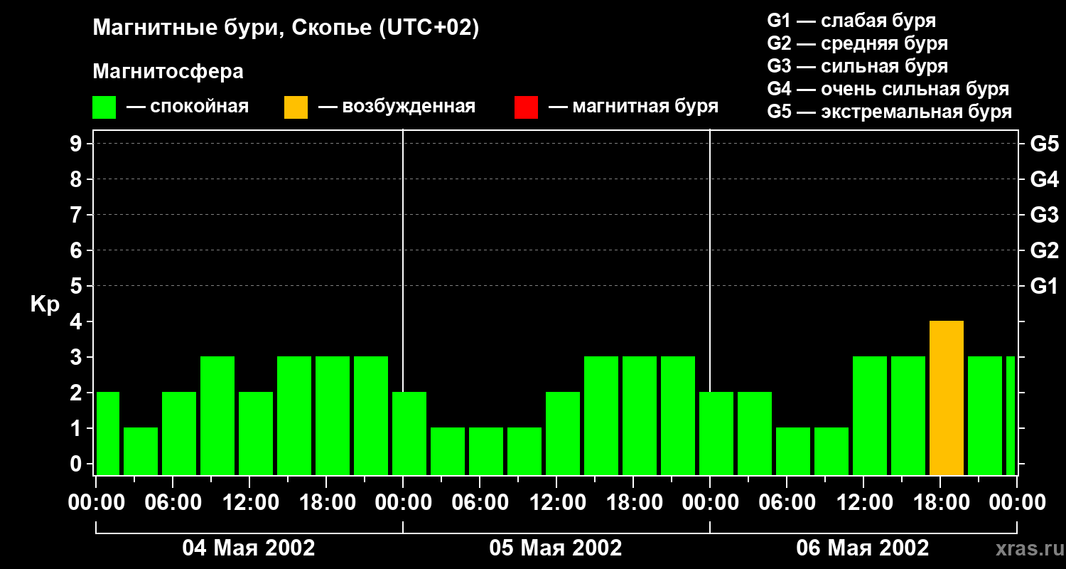 Изменения геомагнитного индекса Kp с 4 по 6 мая 2002 года для средних широт