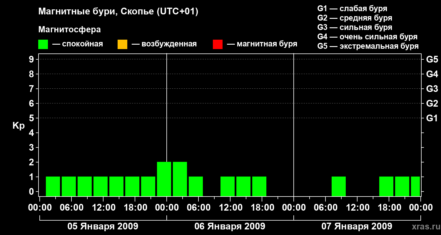 Изменения геомагнитного индекса Kp с 5 по 7 января 2009 года для средних широт