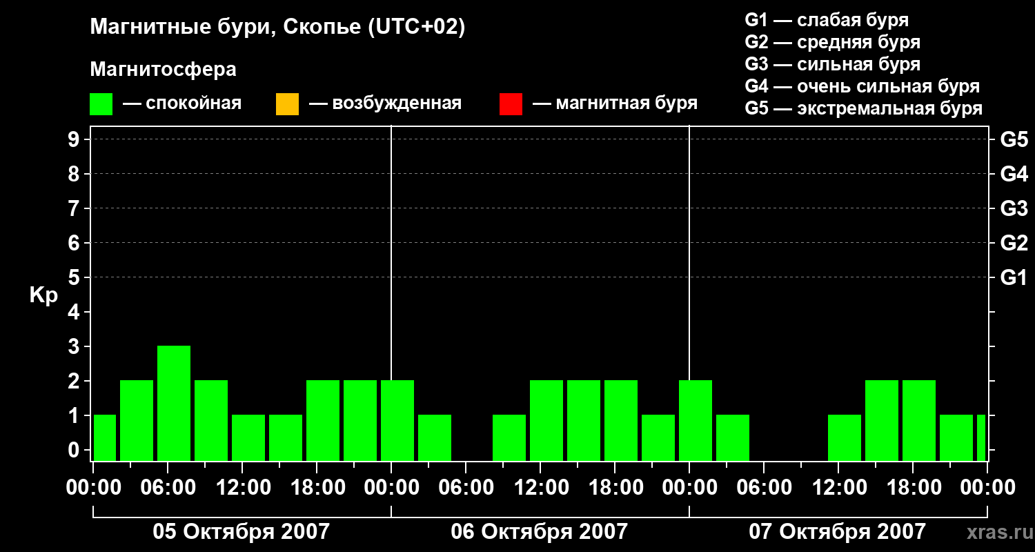 Изменения геомагнитного индекса Kp с 5 по 7 октября 2007 года для средних широт