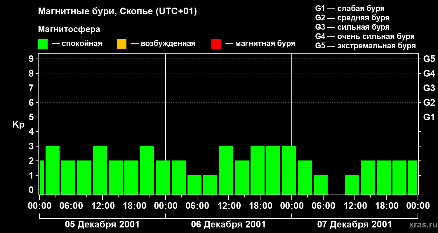 Изменения геомагнитного индекса Kp с 5 по 7 декабря 2001 года для средних широт