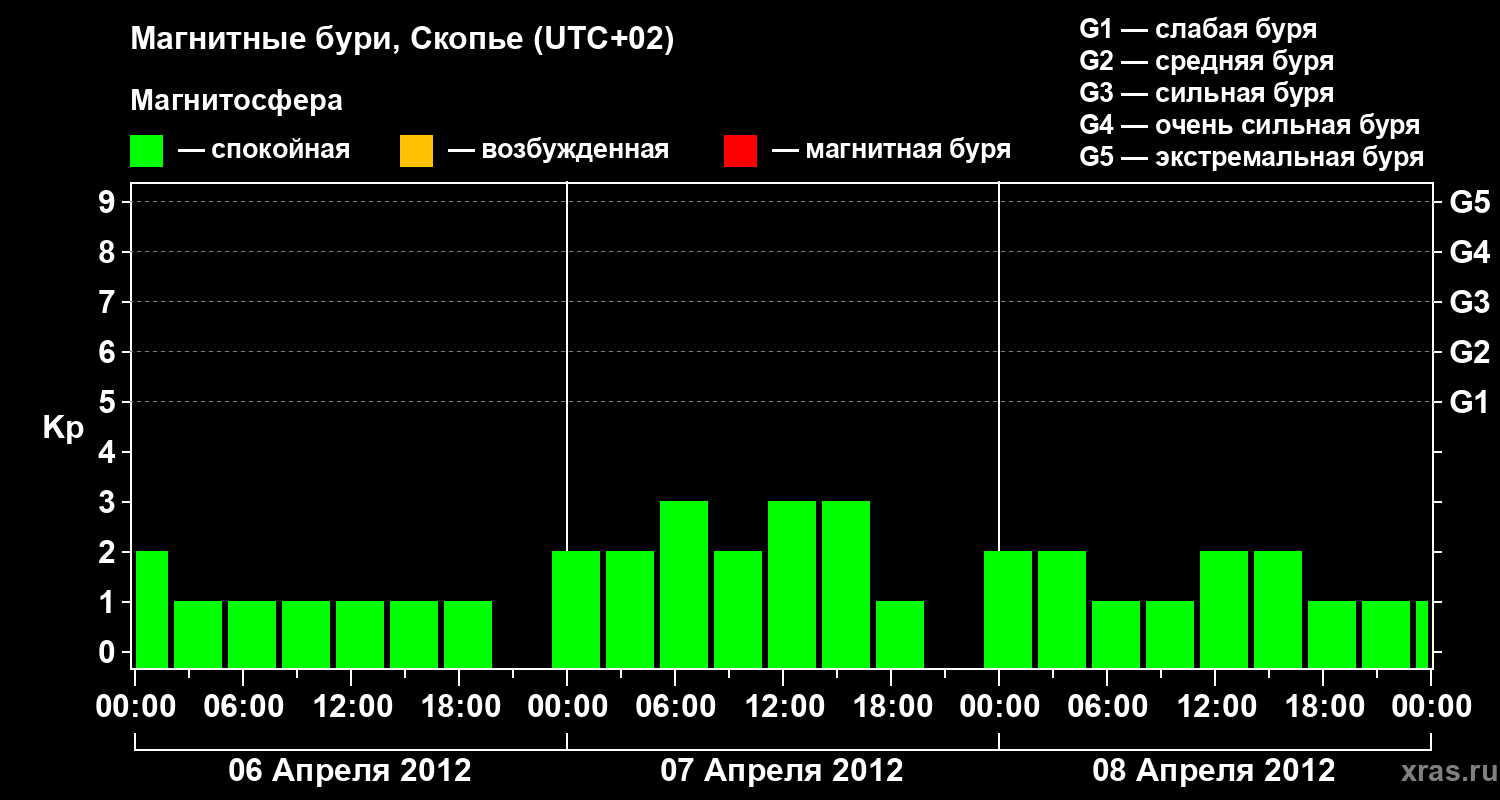 Изменения геомагнитного индекса Kp с 6 по 8 апреля 2012 года для средних широт