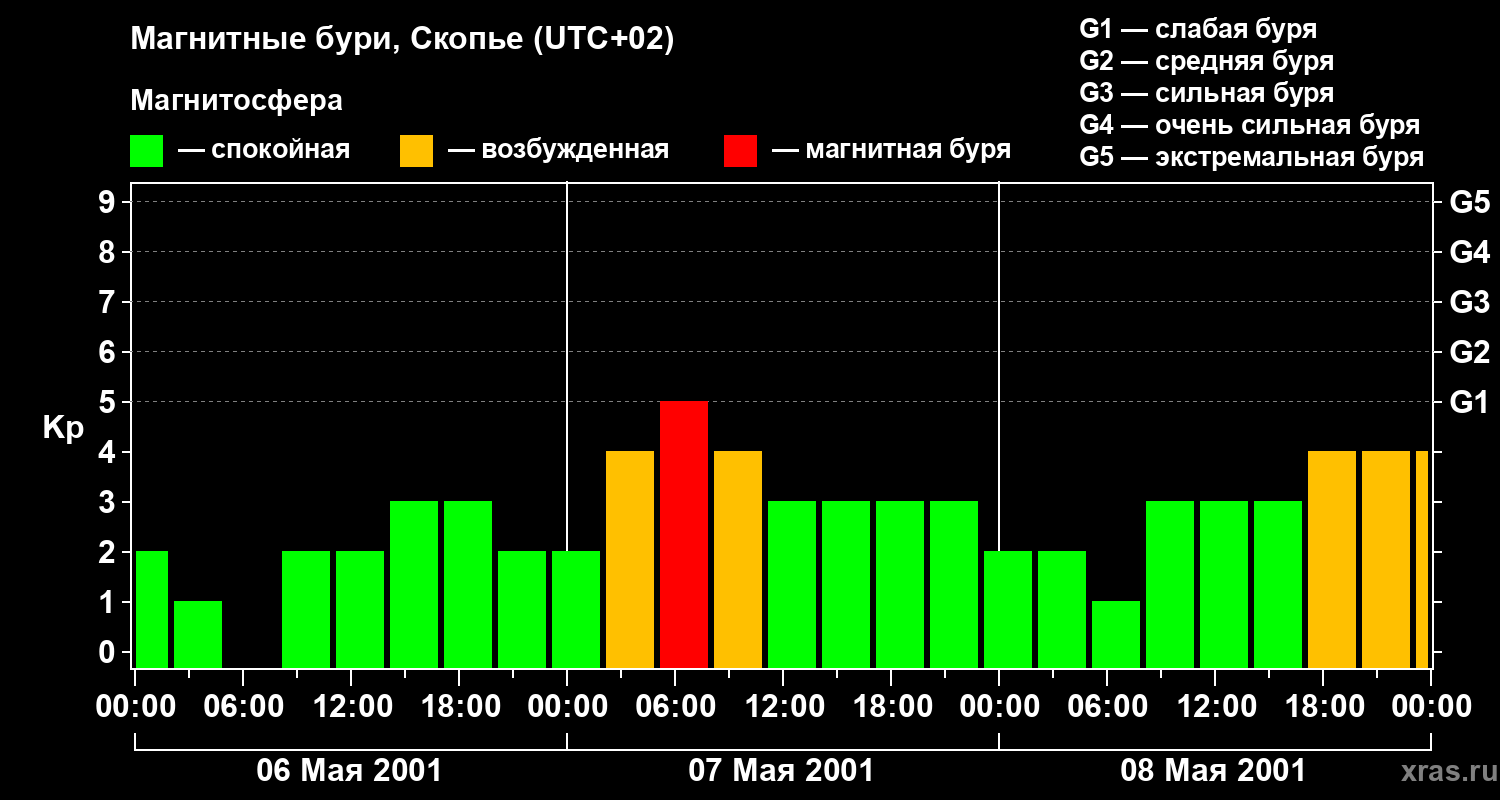 Изменения геомагнитного индекса Kp с 6 по 8 мая 2001 года для средних широт