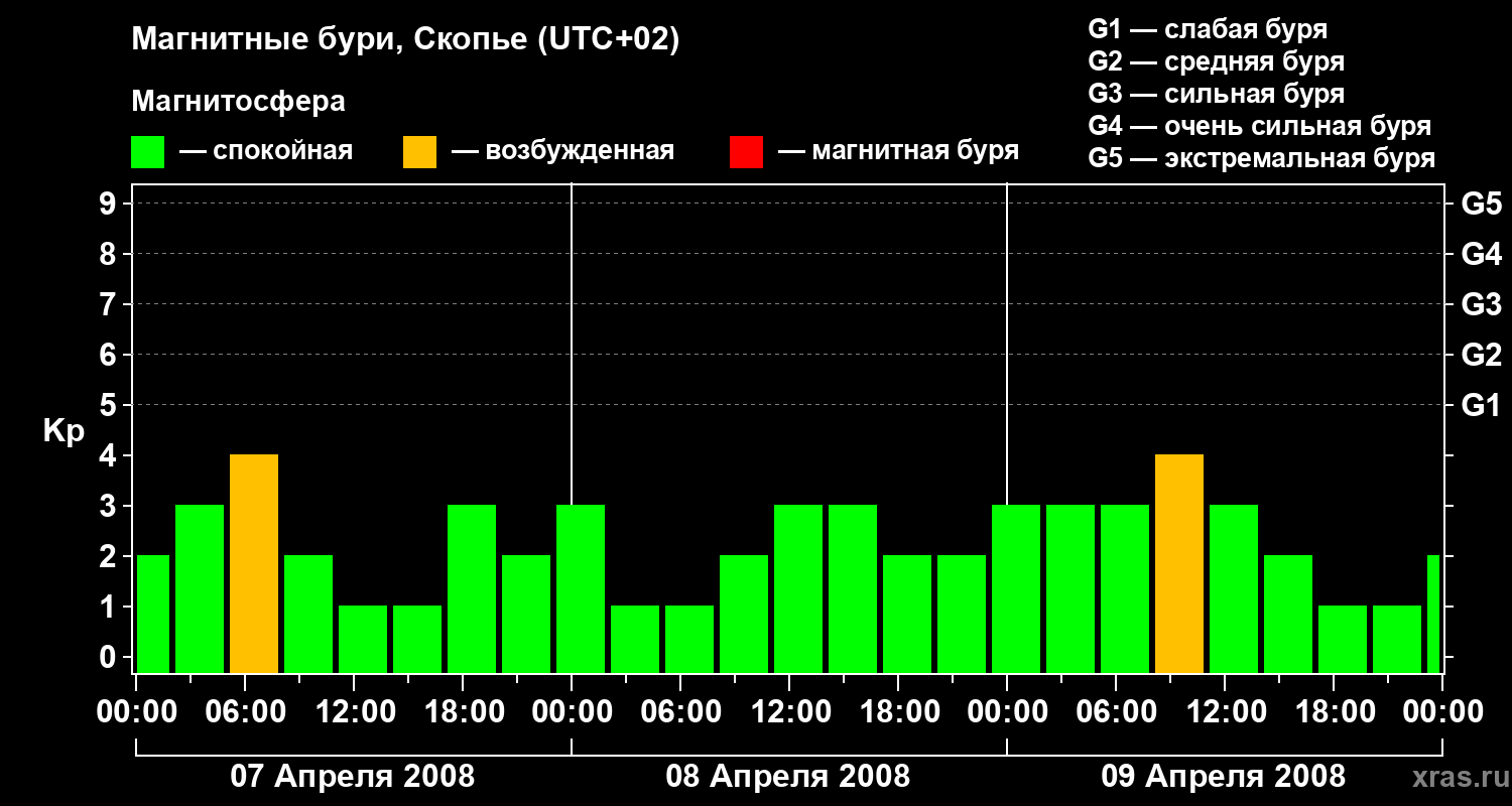Изменения геомагнитного индекса Kp с 7 по 9 апреля 2008 года для средних широт