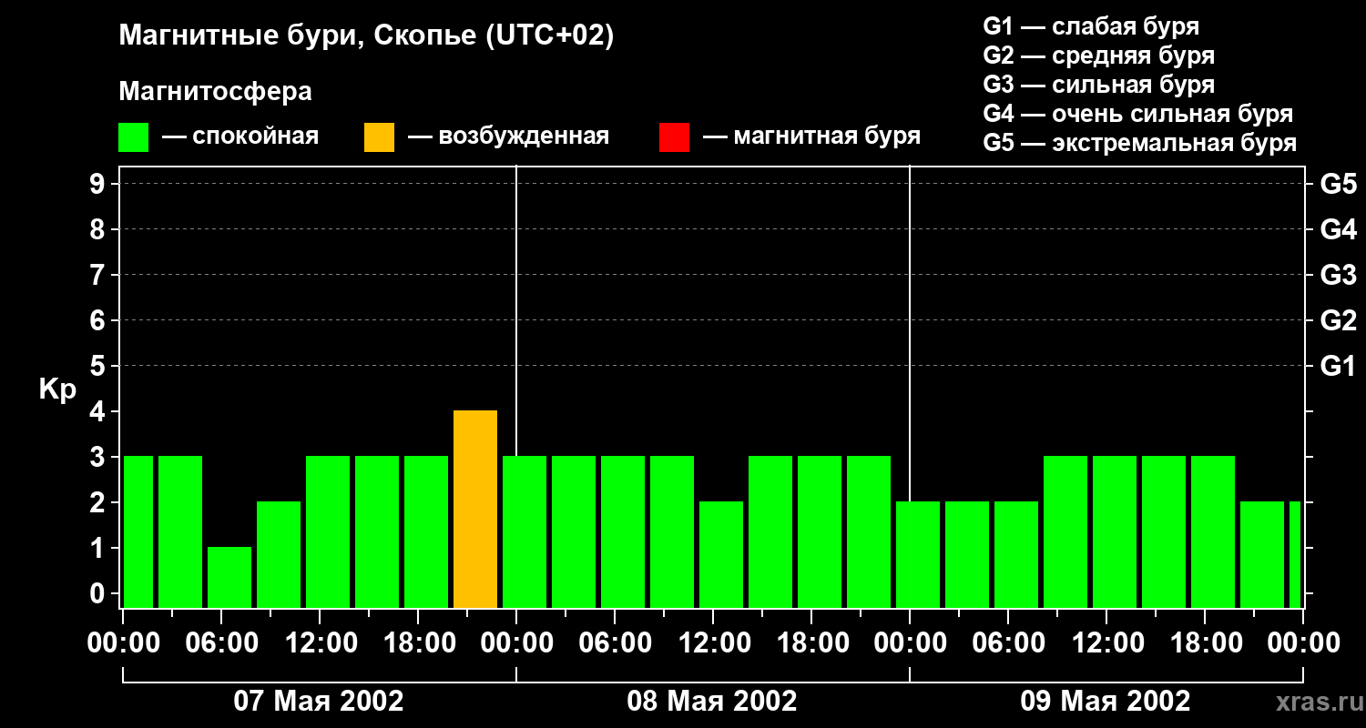 Изменения геомагнитного индекса Kp с 7 по 9 мая 2002 года для средних широт