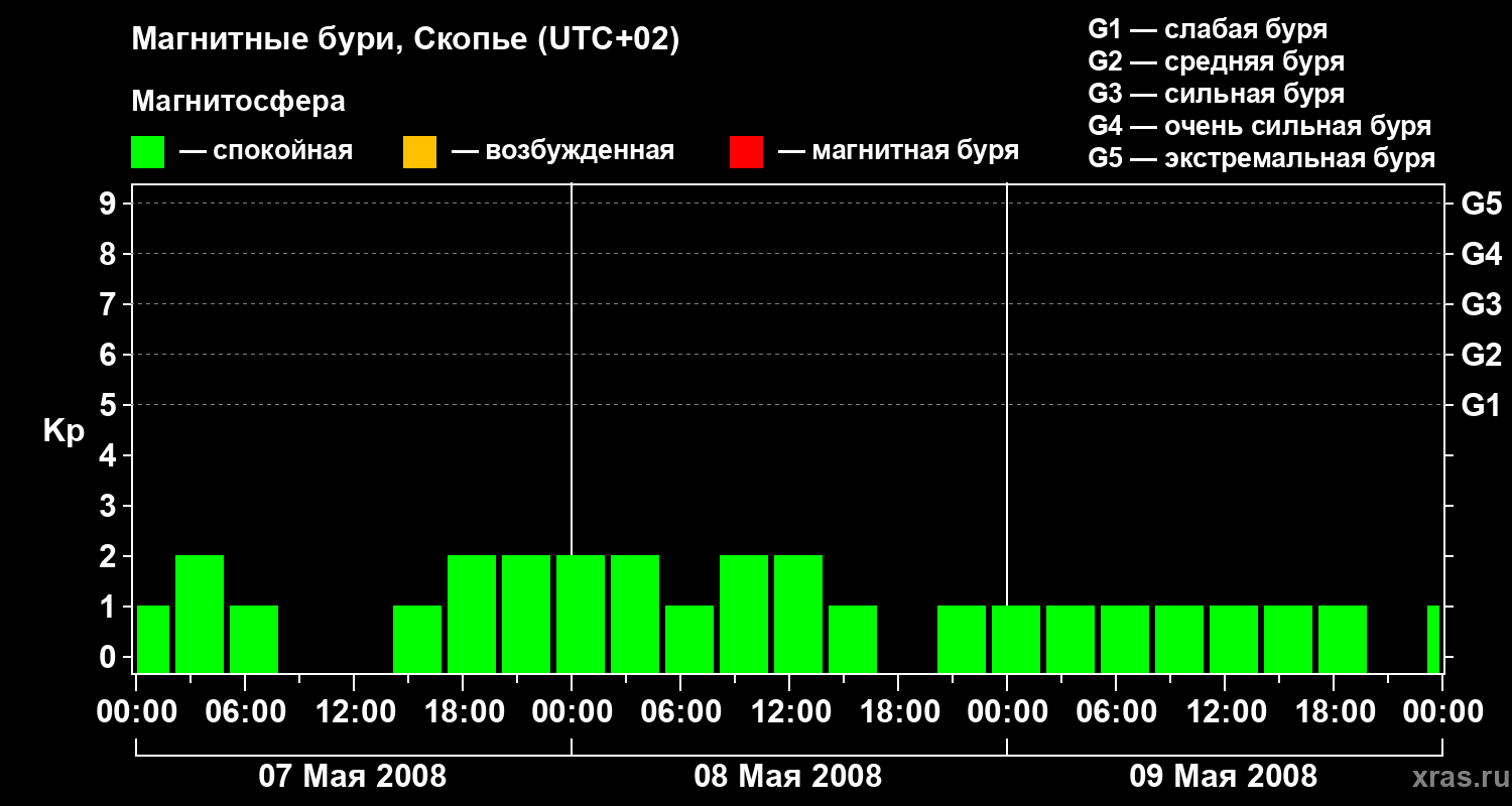 Изменения геомагнитного индекса Kp с 7 по 9 мая 2008 года для средних широт
