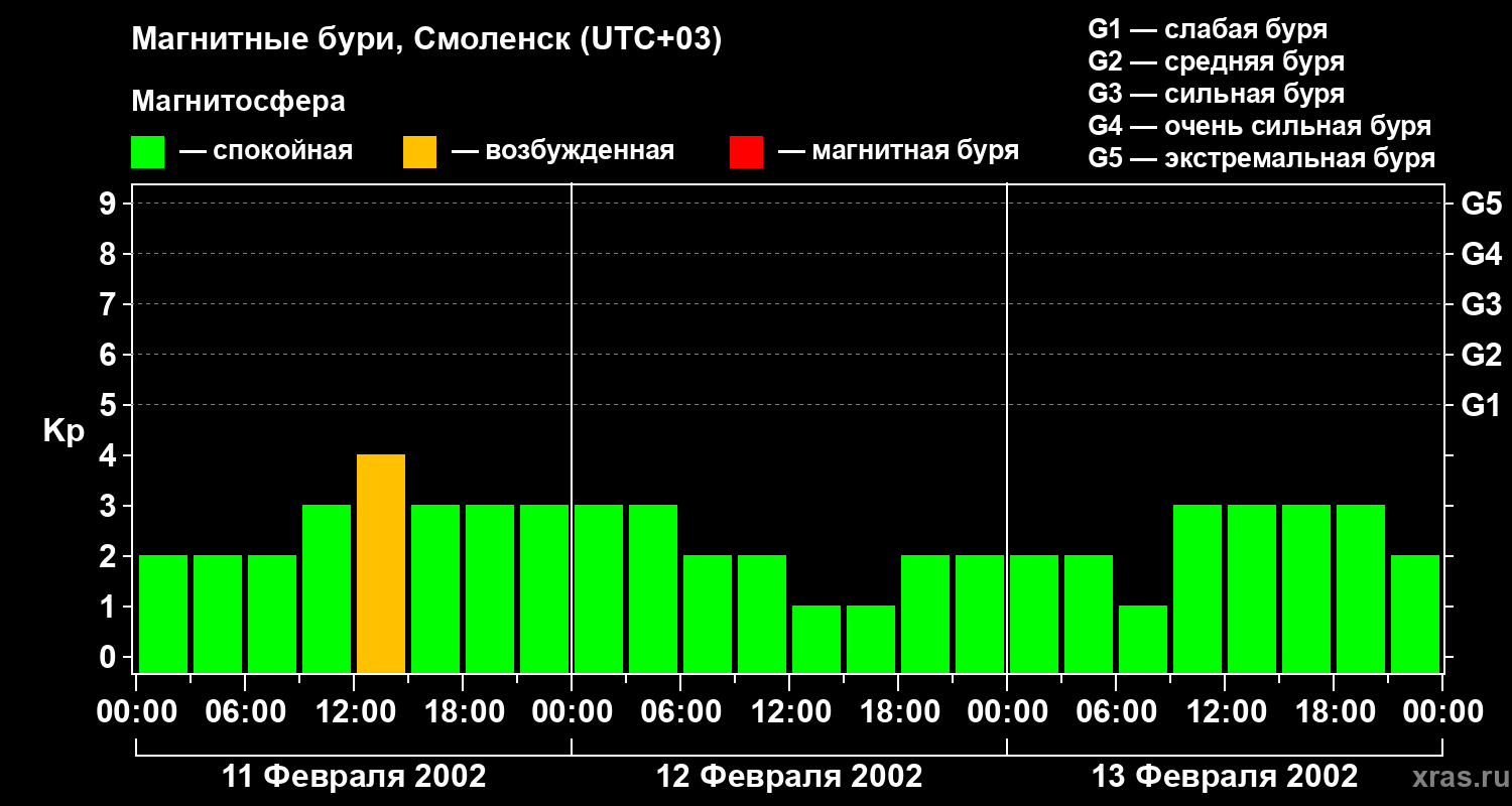 Изменения геомагнитного индекса Kp с 11 по 13 февраля 2002 года для средних широт