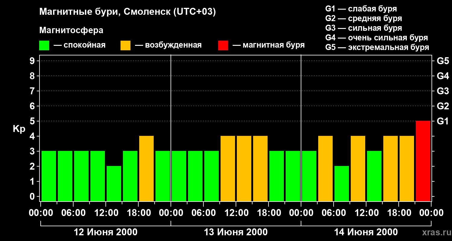 Изменения геомагнитного индекса Kp с 12 по 14 июня 2000 года для средних широт