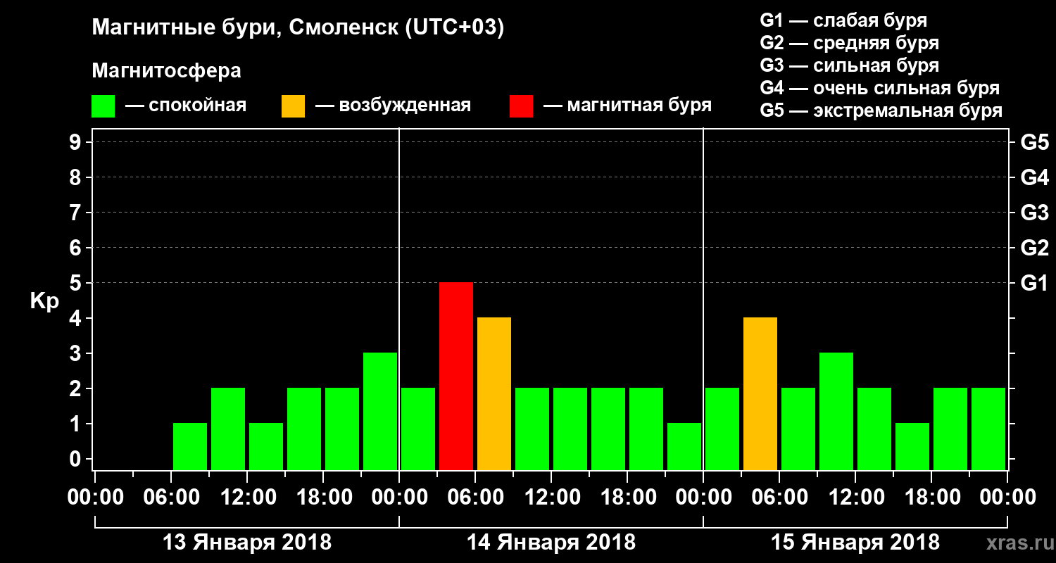 Изменения геомагнитного индекса Kp с 13 по 15 января 2018 года для средних широт