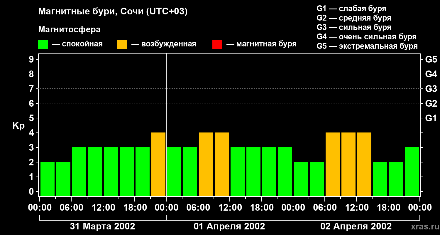 Изменения геомагнитного индекса Kp с 31 марта по 2 апреля 2002 года для средних широт