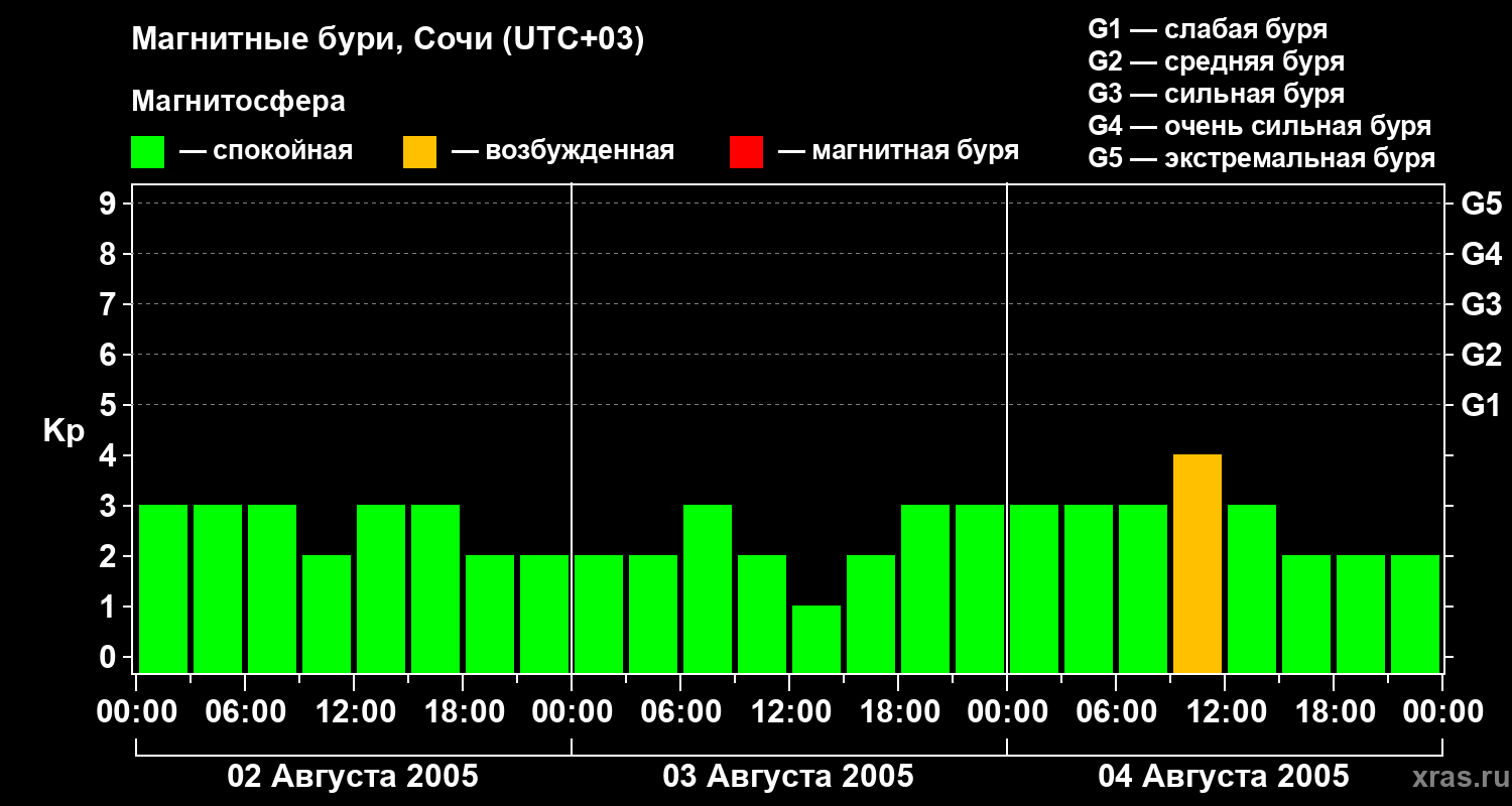Изменения геомагнитного индекса Kp с 2 по 4 августа 2005 года для средних широт